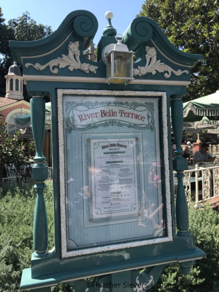 River Belle Terrace is located in Disneyland’s Frontierland, and its styling is ornate and historic. It all starts with this embellished menu board in front of the restaurant. Check out the filigreed carvings.