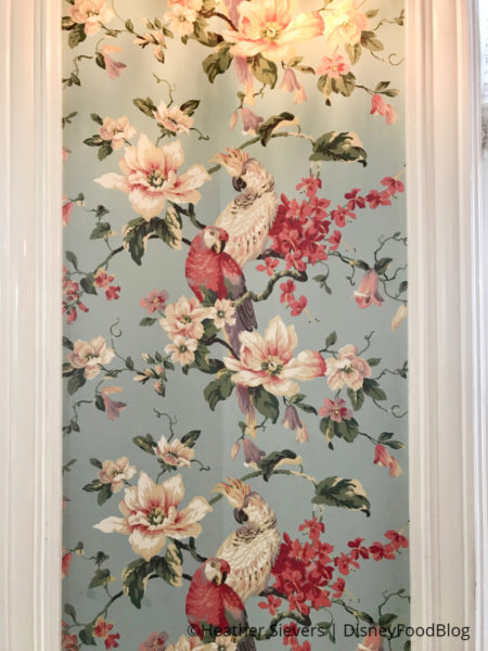There’s a definite attempt to bring the outdoors in here, with floral motifs evident everywhere you look. Banquet seating is upholstered with blooms, and even metal elements feature swirls and flourishes.