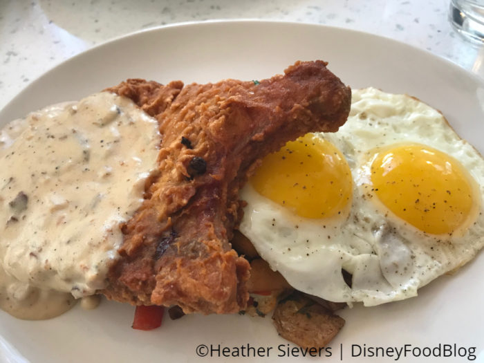 The Southern-Fried Bone-In Pork Chop is another hefty, meaty option. Also served with two sunny-side up eggs, the pork chop is fried to a deep golden brown and is slathered in bacon gravy. Say it with us: Bacon. Gravy.