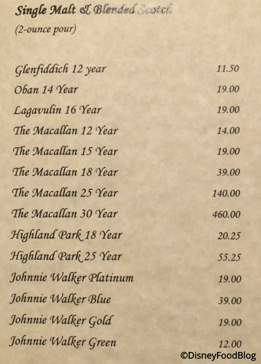 There’s also an extensive Single Malt & Blended Scotch Menu, with prices ranging from $11.50 to $460.00 per two-ounce pour.