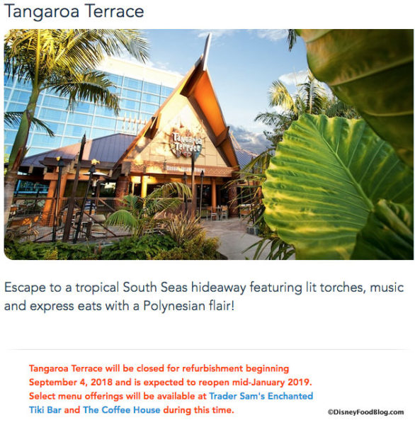 Disneyland Hotel’s Tangaroa Terrace, an island-inspired dining getaway, will close soon for a rather lengthy refurbishment.