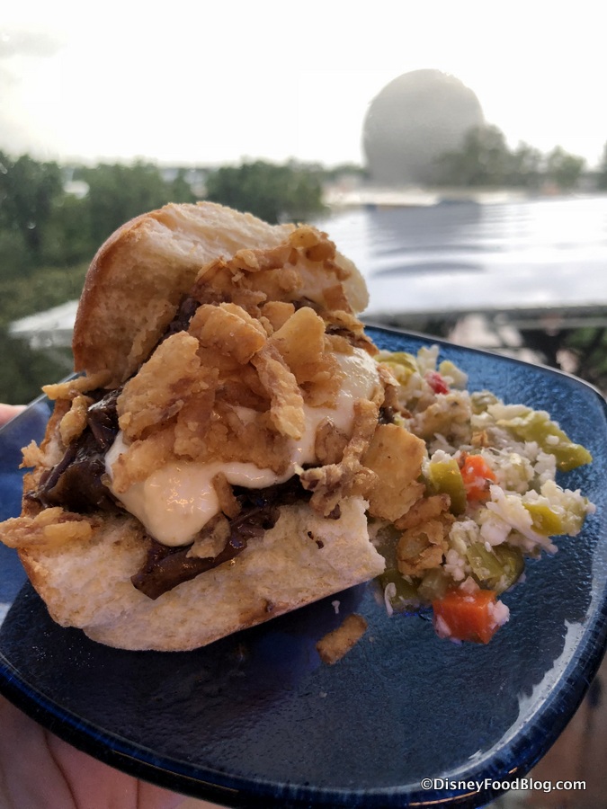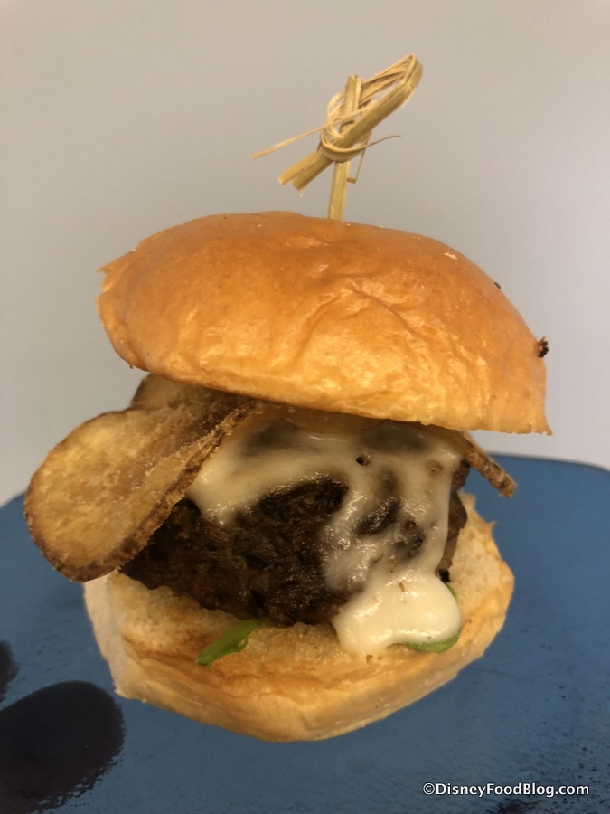 It’s a blended beef with wild mushroom slider topped with brie cheese fondue (!!!), arugula, truffle, and a blue cheese potato chip… all on a brioche bun!