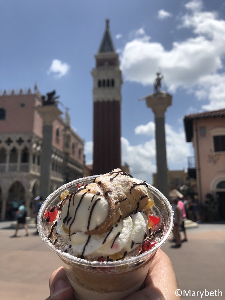The Gelato Kiosk in Epcot’s Italy Pavilion is home to some yummy eats, including a Cannoli Cupcake! DFB reader Marybeth shared this pic with us as she was “eating her way through Epcot.” That’s the best way to do it!