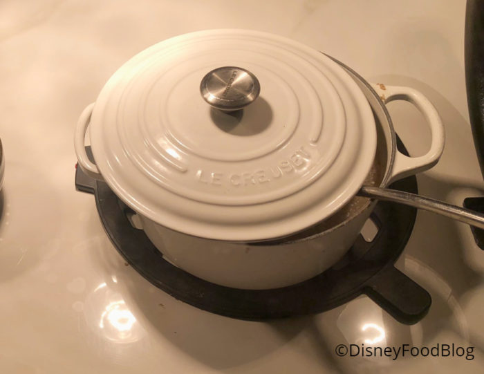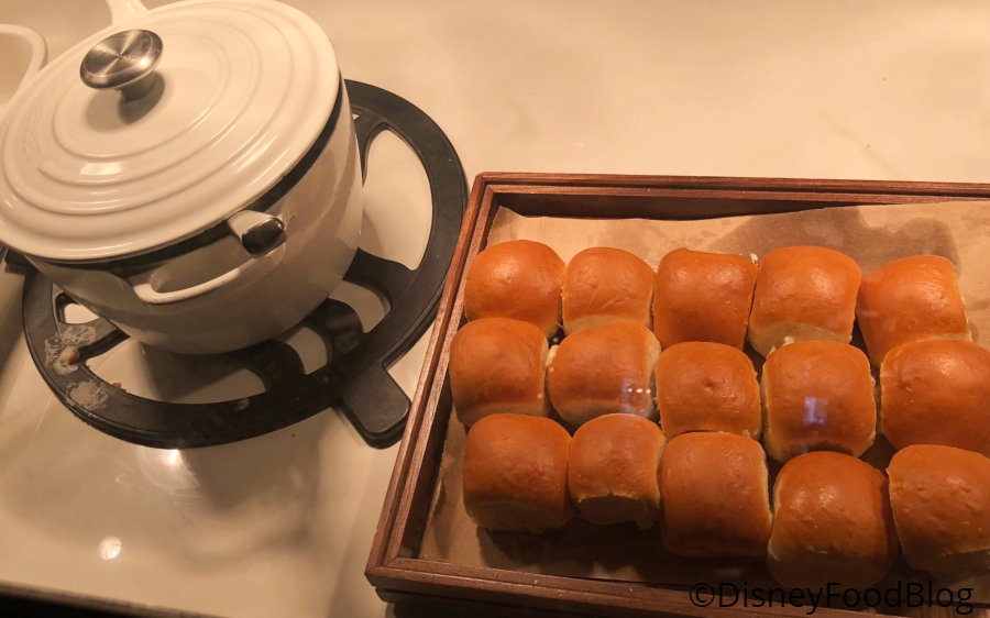 Gravy is served in a giant cast iron pot. And Parker House Rolls are a nice addition.