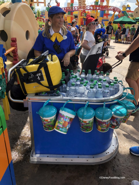 As we entered Toy Story Land we could see that they are now offering “pre-assembled” popcorn buckets with the “hidden food” design we love so much in addition to water at the entrance to this new area.