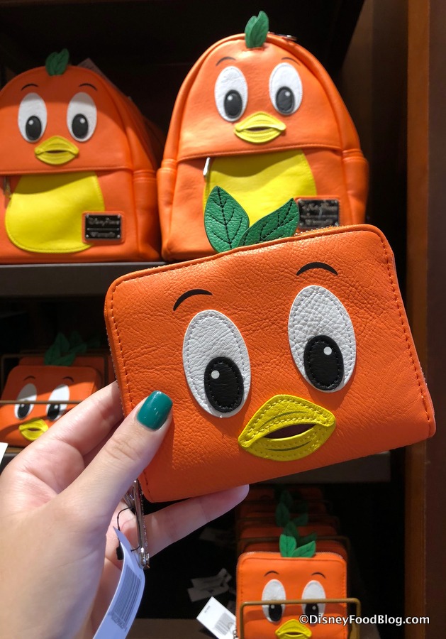 Why, it’s the Little Orange Bird from Adventureland’s Sunshine Tree Terrace! You can find him in the Mini Backpack as seen above, along with a Little Orange Bird wallet.