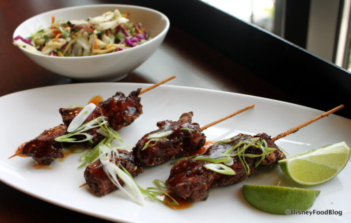 The guest-favorite Chicken Skewers are topped with an Asian slaw and seasoned with togarashi to deliver some heat! (I’m not a big slaw fan, so I ordered my slaw on the side.) These were excellent — savory with a tiny kick.