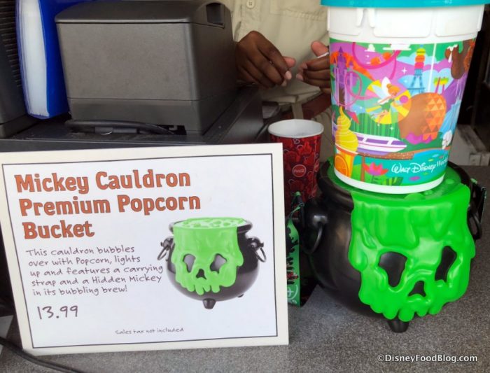 And though in Disney World the Green Poison Apple Stein was only announced for Animal Kingdom when the Halloween Souvenirs were revealed for this year, the Cauldron Bucket is appearing in all four Disney World parks and Disney Springs. We first saw it at the Main Street, U.S.A. Popcorn Cart in Magic Kingdom!