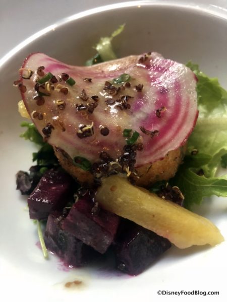 Wild About Wild incorporates the Wild About nettle syrup into a buttermilk dressing that tops the wild mushroom and herb goat cheese terrine with pickled, candied, and purple beets. Roasted quinoa crumbles finish the plate.