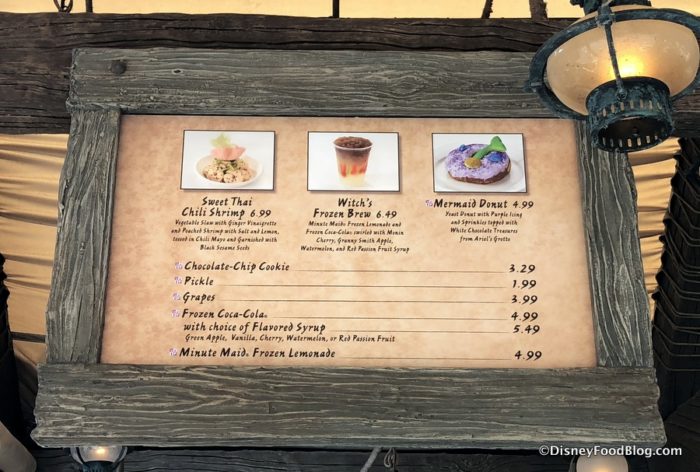 Does that seem like an odd greeting from this location themed to The Little Mermaid (and located directly across from the Under the Sea — Journey of the Little Mermaid attraction)? Well, let me explain… Prince Eric is currently serving up Witch’s Frozen Brew — along with a few other new items — for the season!