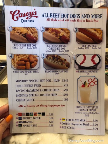 Those famous Casey’s french fries have gotten a couple of makeovers on the new Casey’s Corner menu. First up, they’ve been doused with that electric orange mac and cheese that’s used on the mac and cheese dog here, and then dusted with bacon bits to boot.