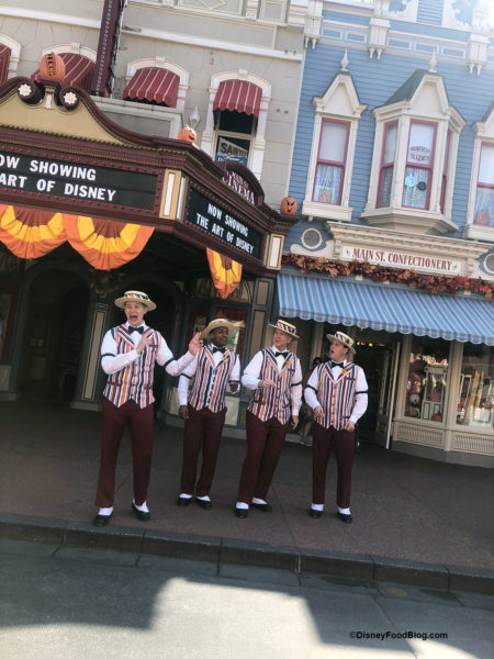 The Dapper Dans are performing on Main Street as usual, but now they are in their Fall Gear with autumn-inspired colors – and that also means some new songs have been added to their repertoire. See if you can catch them performing the Headless Horseman Song. That’s a can’t miss!