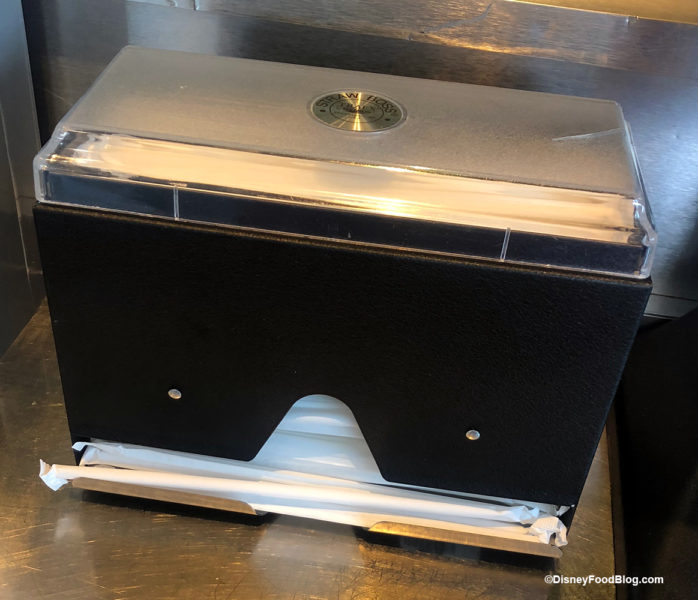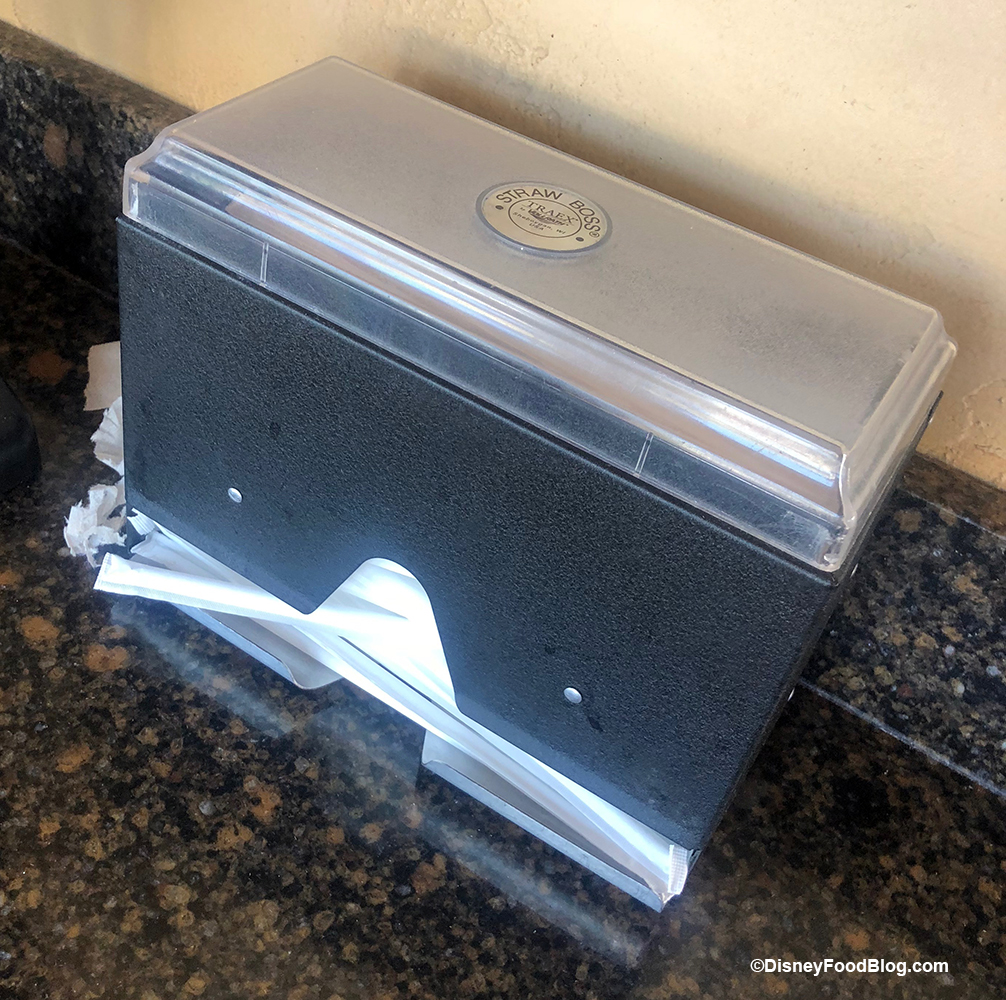We found straws at all counter service locations in the Magic Kingdom – and you can pick them up on their own. They are not request only, behind a counter, or eliminated yet at counter service restaurants.