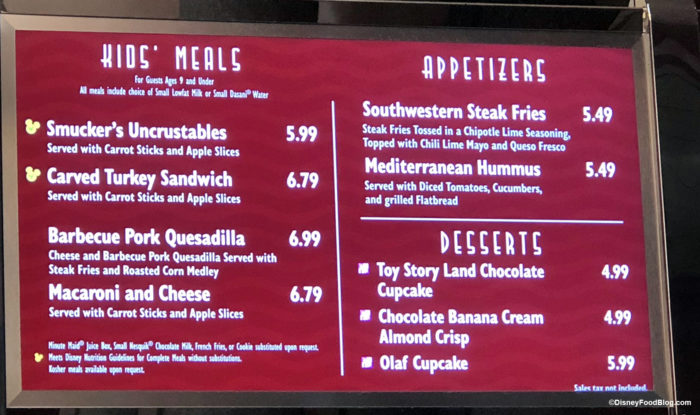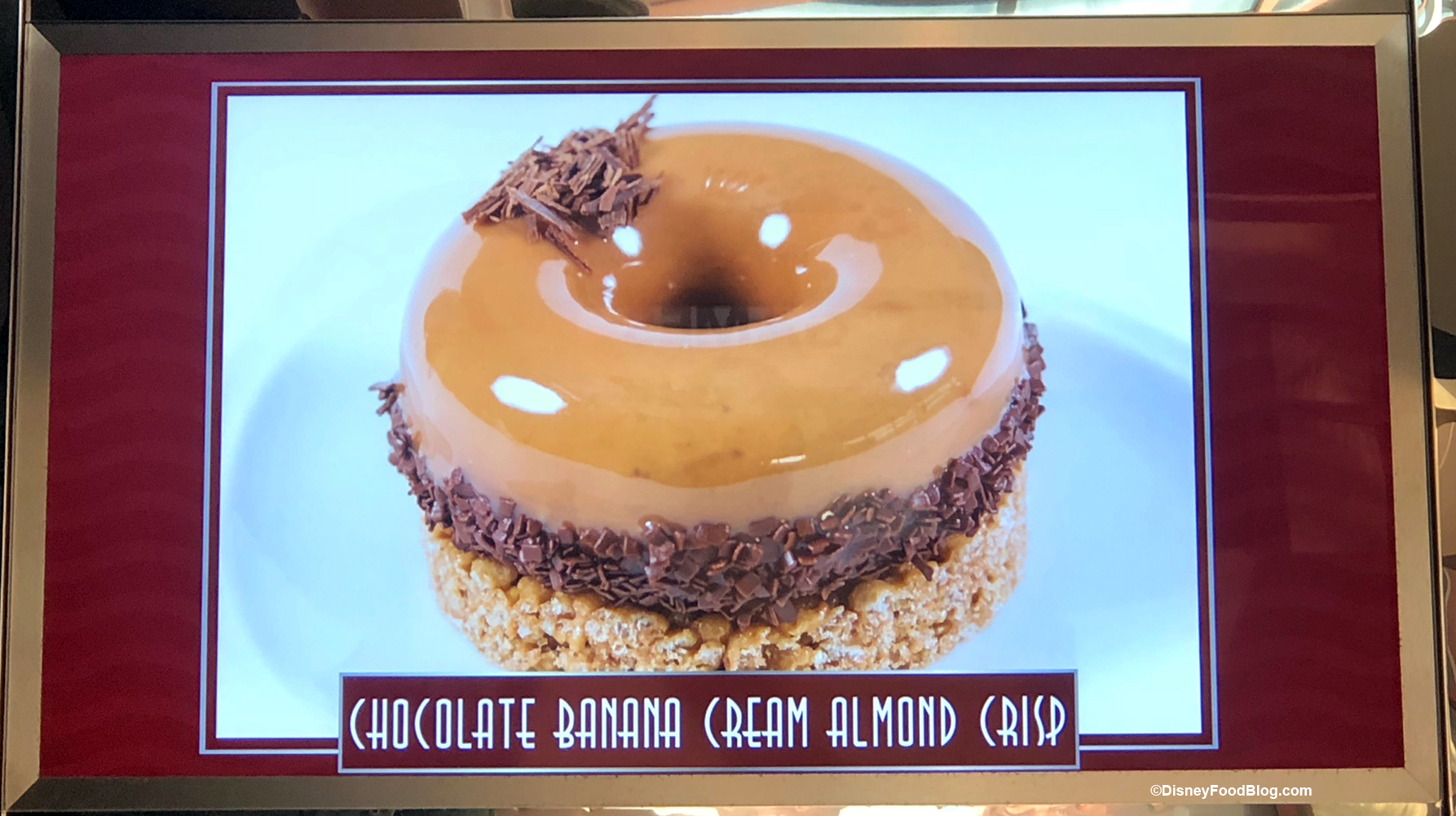 And dessert — there’s that Toy Story Land cupcake again! It is joined by a new-ish Chocolate Banana Cream Almond Crisp dessert.