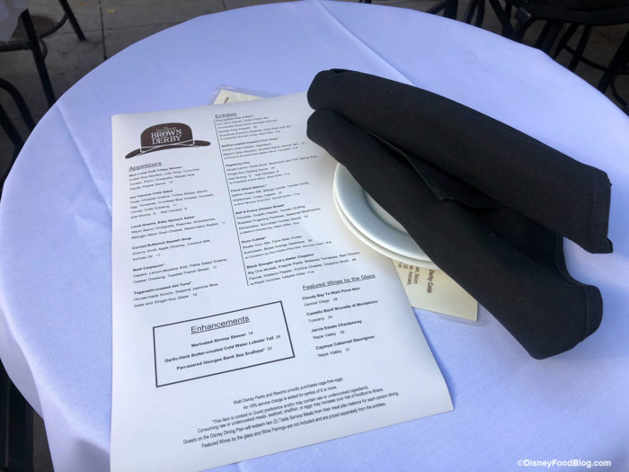 We also spotted the Brown Derby restaurant menu on the tables in the outdoor Brown Derby Lounge. You’ve always been able to request restaurant menu items while at the lounge, but we’ve never seen a restaurant menu on the lounge tables before. The lounge does have their own tapas style menu.