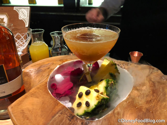 The drink creation was The Manifesto, which is a mixture of Rye Whiskey, Gin, Pineapple Juice, and Chili Bitters poured over a coffee ice cube and topped with edible flowers. Before pouring the drink, the glass was sprayed with fresh rose water.