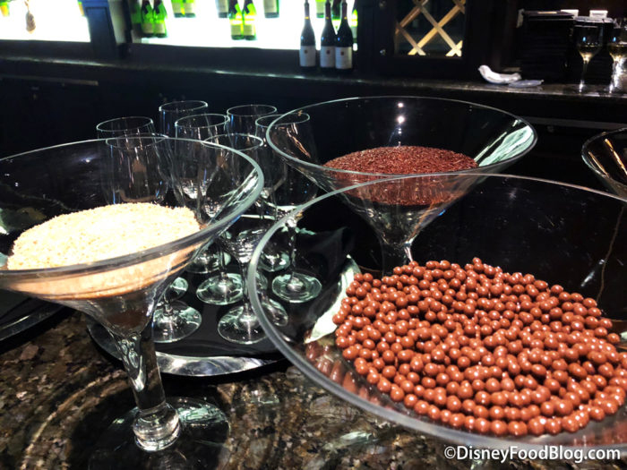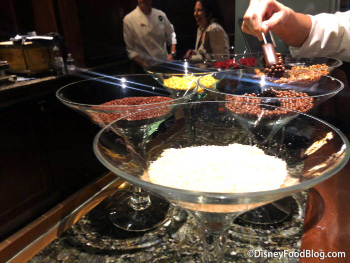 The station featured oversized martini glasses filled with gourmet toppings including hand-dipped chocolates, coconut, caramelized almonds, and more.
