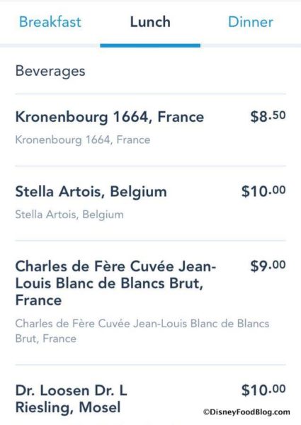However, that has now changed, as alcoholic beverages are now listed on the menu for breakfast and lunch as well. Alcoholic beverages at breakfast include a Mimosa and Be Our Guest Peach Bellini, among others.