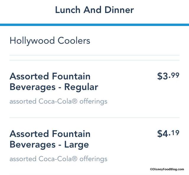 With thanks to Instagram friend rgrrabbit1, we have the following example: A regular Fountain Beverage at Disneyland Resort is now $3.99 (up from $3.59 just this past Sunday) and a large Fountain Beverage is $4.19 (up from $3.99). The prices below — as a posted example — are taken from the Award Wieners menu on the Disneyland app.