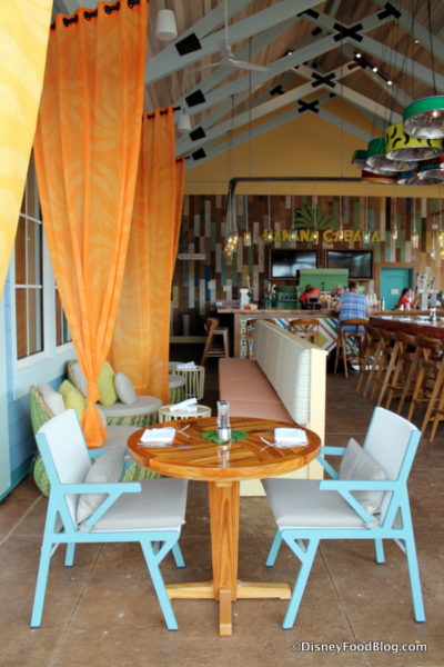 The change is immediately striking. Banana Cabana was previously a setup of a simple bar surrounded by stools with tables and umbrellas surrounding it. And while it was a fun place to sit and chat for a while, it was much more about keeping guests right by the pool. (Check out the old look here.)