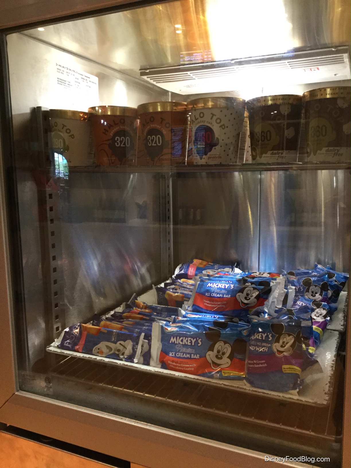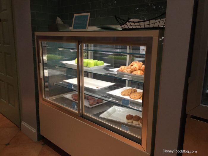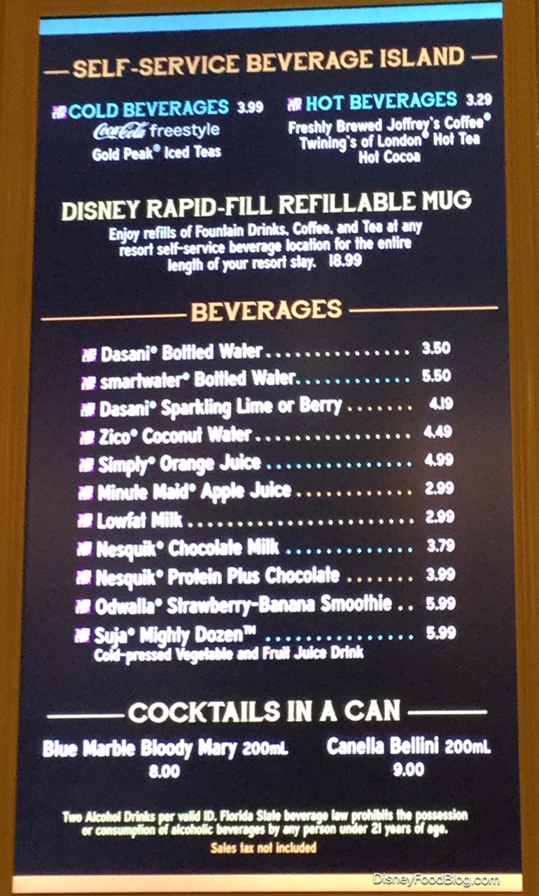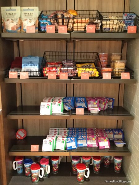 We’ll explore the counter service in the “eats” portion of this post, but a quick look at the grab-’n-go selections reveal staples such as bottled beverages, allergy-friendly pre-packaged snacks, Mickey Ice Cream Bars, Halo Top Ice Cream, a selection of baked goods, cereal, and snacks, and Resort Refillable Mugs.