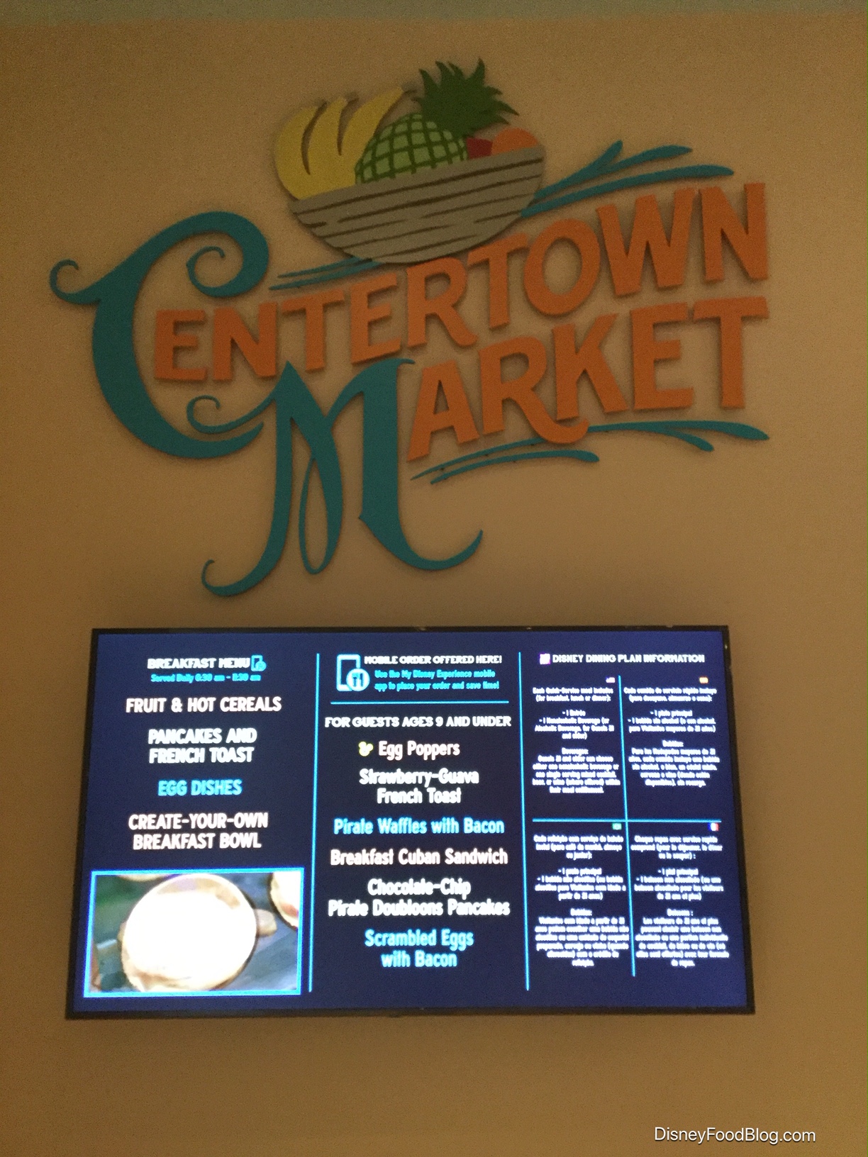 We were there for Breakfast – stay tuned as we update this post with Dinner options. (Remember, as mentioned earlier, the current lunch options are Sebastian’s Bistro, Banana Cabana, and the Grab and Go location in Centertown Market, though we’ll be keeping you posted on any changes.) And stay tuned for our full reviews, too!