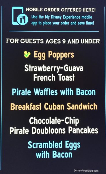 During Breakfast you’ll pick up your food from pick up windows when your buzzer goes off. At dinner you’ll receive a pager/tracker and place that on your table, and your meal will be delivered to you — similar to the breakfast/lunch experience at Be Our Guest Restaurant and other counter service locations around WDW.