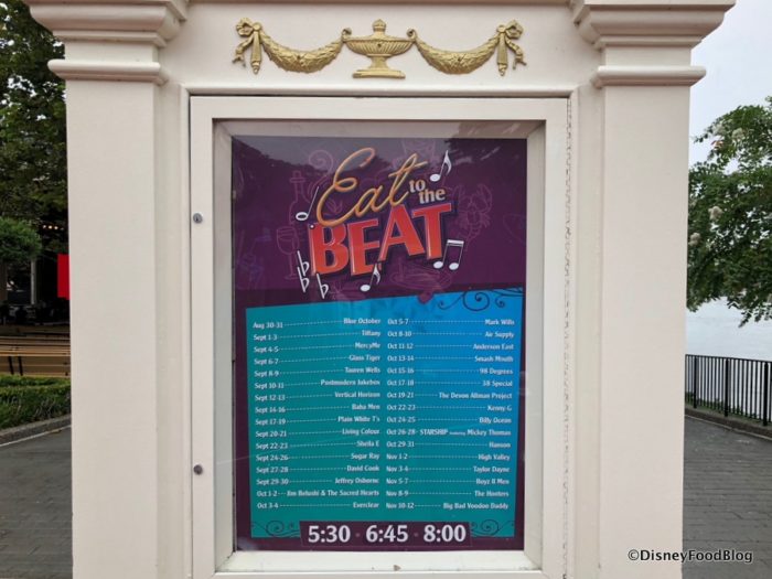 Eat to the Beat Concerts are free with Epcot admission, and take place three times per evening (5:30pm, 6:45pm, 8:00pm) throughout the duration of the Festival which is running through November 12, 2018.