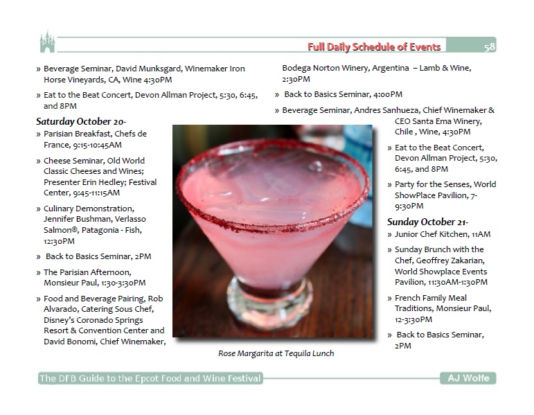 Other fun and useful sections in the Guide include a full list of performers for the Eat to the Beat Concert Series, Booth Crawls — a fun way to experience the Food and Wine Festival booths, Celebrity Chef Spotlight where you can learn about many of the celebrity chefs coming to the festival, Frequently Asked Questions, how to avoid the crowds, and much more!