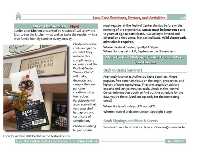 The DFB Guide to the 2018 Epcot Food and Wine Festival also includes information on the Low-Cost and Free Seminars and Demonstrations including the Mix It, Make It, Celebrate It! Hands-On Workshops, Back to Basics, and more.