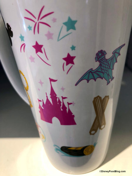 Mickey Bars, Mickey Pretzels, and Churros! Plus references to the Haunted Mansion and “it’s a small world”. We love this mug.