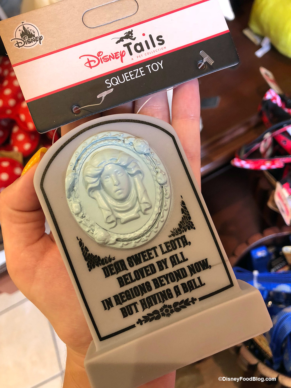Just last week we shared all the new and quite frankly too cute Disney Tails merch we found in Hollywood Studios. Now, after you put your puppy in the Haunted Mansion Comfort Harness you can give them this Madame Leota tombstone sqeeze toy!