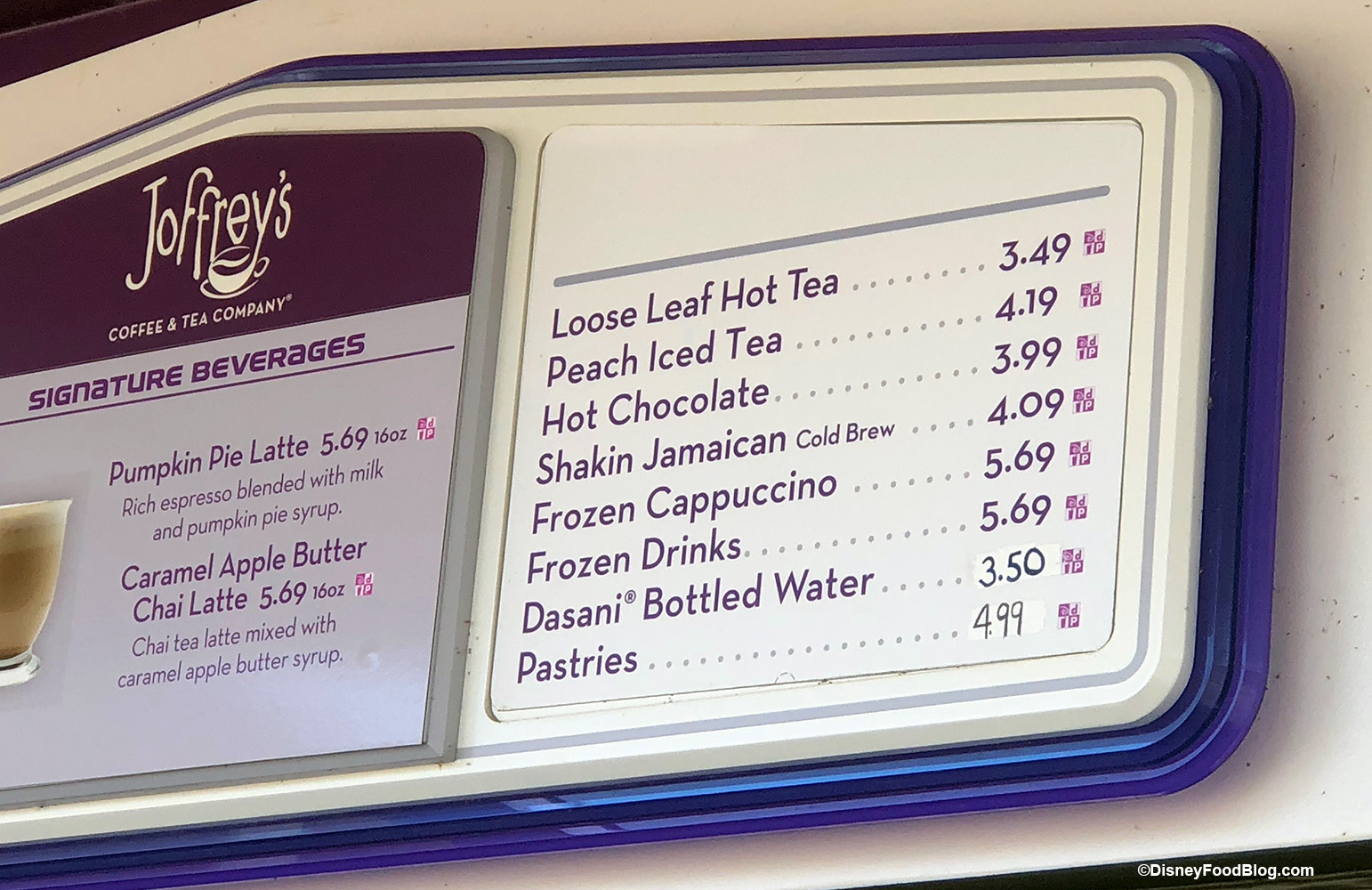 We spotted another recent price increase in the Magic Kingdom. This one is so new they haven’t even printed a new menu yet — just adjusted the price by hand! The Joffrey’s Revive Stand in Tomorrowland has increased the price of their pastries to $4.99, up from $4.19. They also increased the price of Dasani Bottled Water from $3.00 to $3.50.