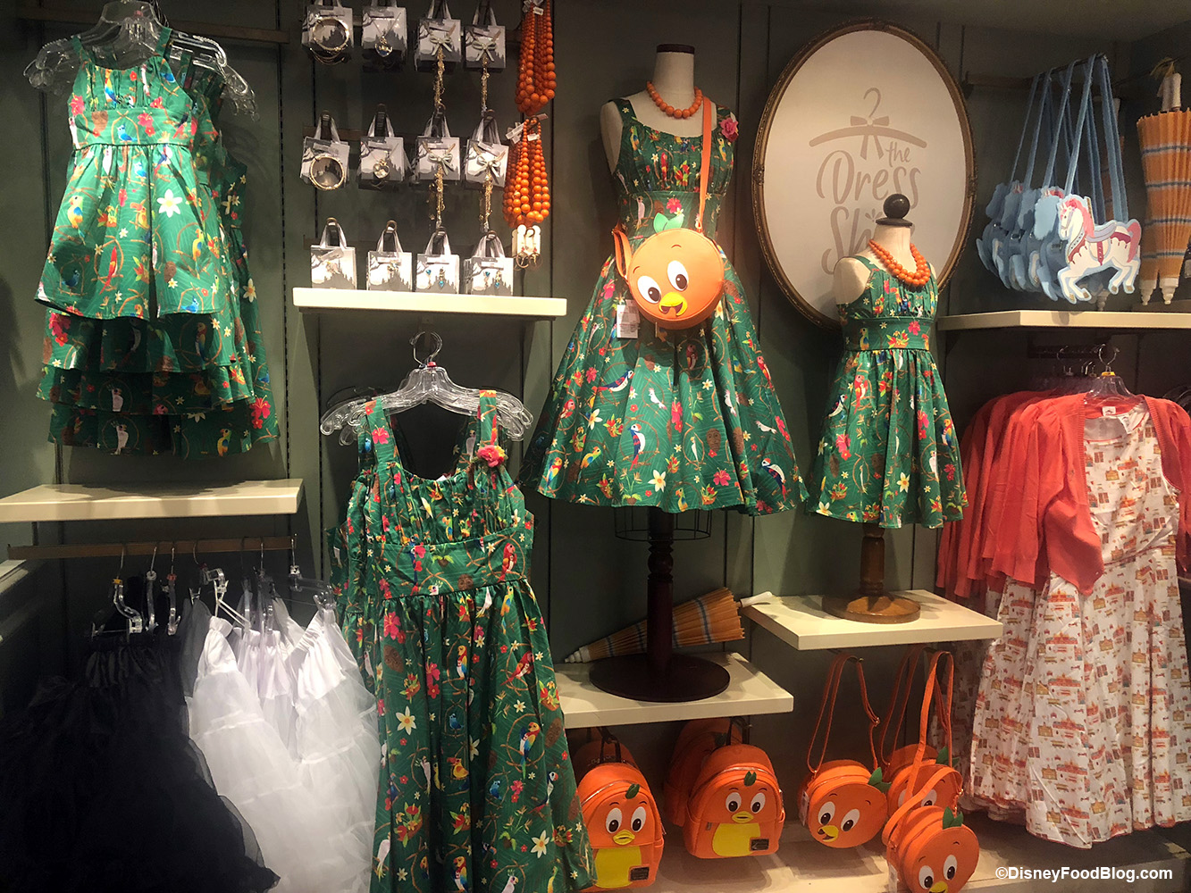 , and you can also find a Dress Shop in Disney Springs’ Marketplace Co-op. You’ll find women’s and girls’ dresses themed to all kinds of attractions and rides. Plus, they sneaked that Loungefly Orange Bird bag in there this week!