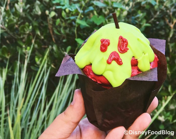 We just showed off a few fun Halloween and fall-time treats unique to Walt Disney World a few days ago, and reviewed that yummy cinnamon pumpkin cupcake in Animal Kingdom as well! Now we’re headed over to Disney’s Wilderness Lodge to tackle another Halloween-y sweet treat — the Poison Apple Cupcake!