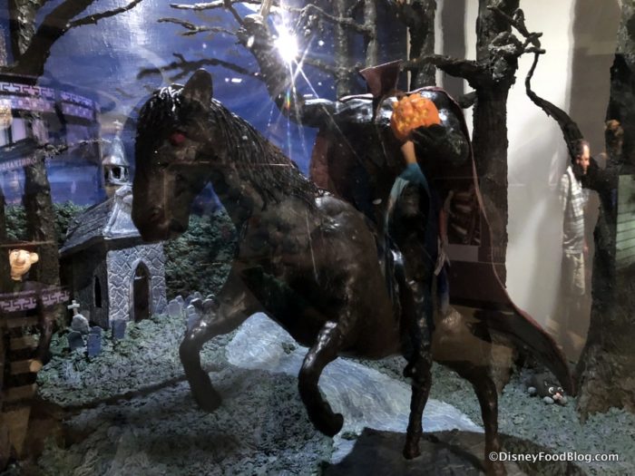 If you look to the left in this picture of The Legend of Sleepy Hollow sculpture by the Boardwalk Inn chefs, you can spot Ichabod Crane himself peering out from behind a tree!