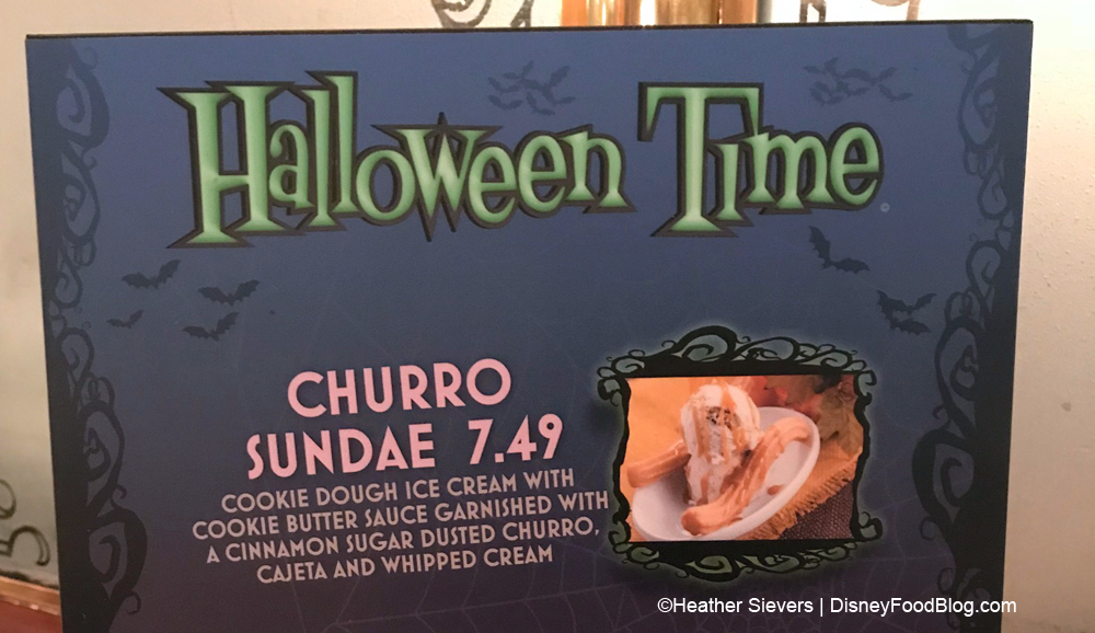 We are eating our way around the Disneyland Resort and enjoying the Halloween Time treats and specials! Our next stop is The Golden Horseshoe for a Churro Sundae!