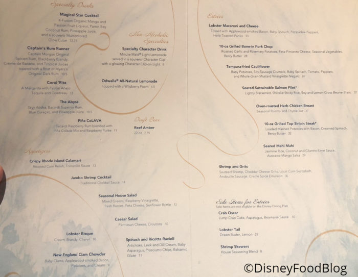 We ate lunch here in November. (Table service on the dining plan). The food was fantastic. Stuffed whole lobster lobster Mac and cheese and we both had the lobster bisque. We indeed to our seafood fix. It was all fantastic. We would have liked to be closer to the aquarium but we could see it from our booth. The service was great. No complaints here. We would go back!