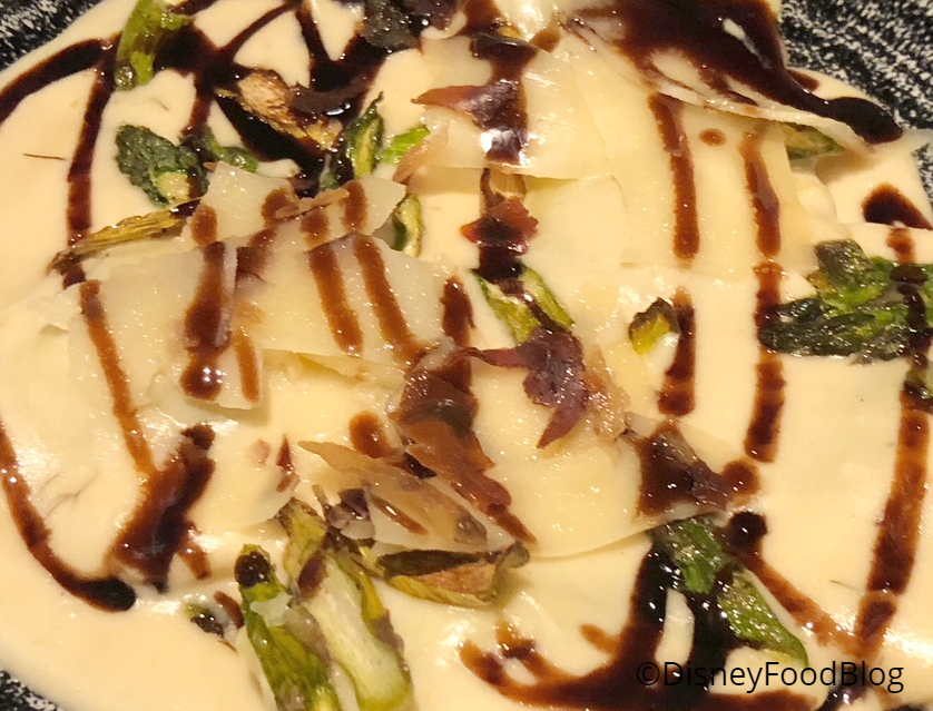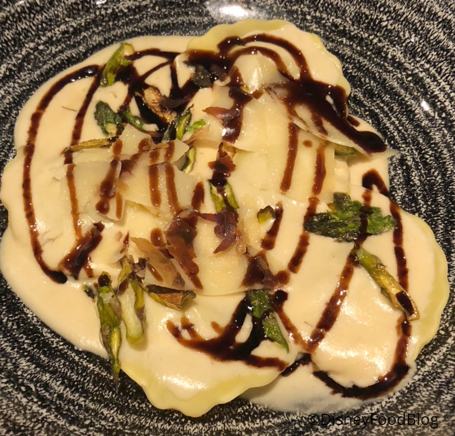 The ravioli are served with Artichoke, Leek, and Dill Cream and topped with Baby Asparagus, Prosciutto Chips, and Balsamic Glaze. The Balsamic Glaze carries a good amount of flavor, but the rest of the flavors were washed out, for me. But, again: my companion loved it, so it’s worth a try if this sounds like something you’d enjoy!