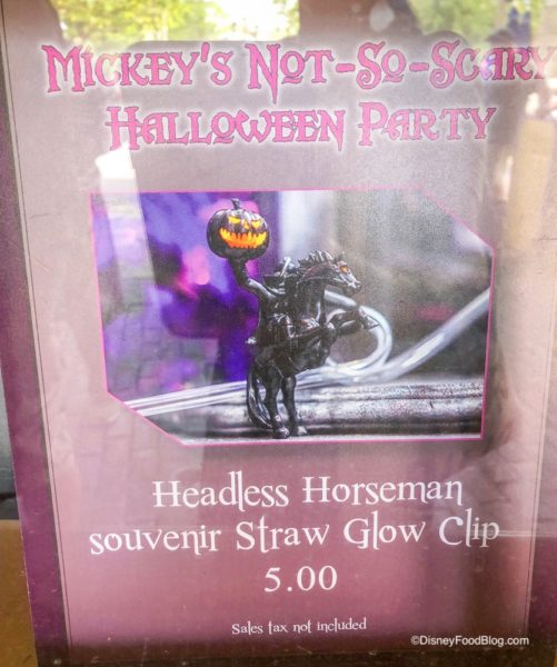 We spotted the Headless Horseman straw clip at Storybook Treats in Fantasyland! This is usually an item exclusive to Mickey’s Not-so-Scary Halloween Party, so we were surprised to see it offered on a non-party day.
