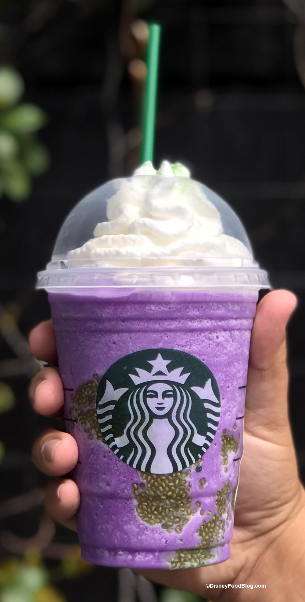 Starbucks describes this as a blend of Toad’s Breath (the purple), a swirl of Bat Warts (the chia seeds), and a dusting of lizard scale powder (the green sugar sprinkled on the whipped cream). Right off the bat (pun intended), our Brew was light on the “Lizard Scale” — can you see it in this picture? We promise it is there!