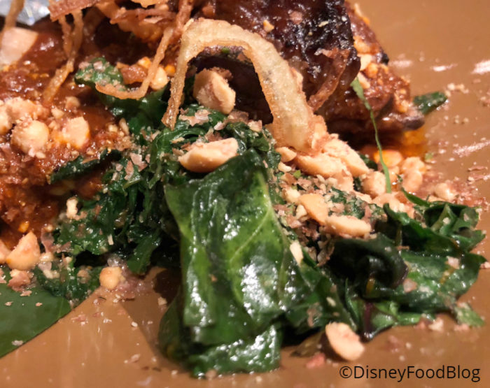 The base of the dish is plantain rice, which, again, serves the purpose of absorbing the sauces and juices from the protein. There’s also some Swiss chard under there.