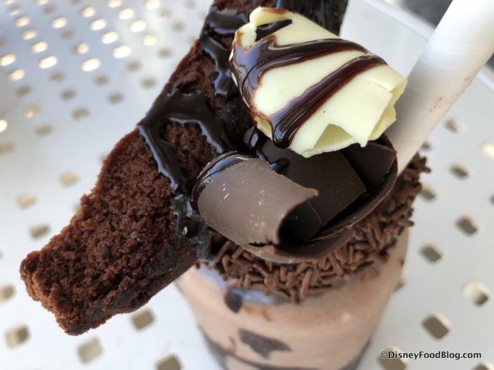 A large (and noticeably soft and fresh) chocolate brownie and individual chocolate pieces more than peek out of the top — they take it over!