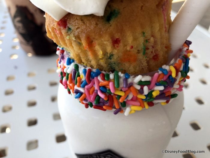 It’s topped with an entire funfetti cupcake which is further topped with frosting and a chocolate Mickey balloon!