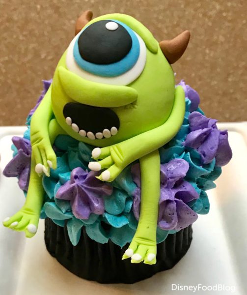 Our team member here at DFB, Emily Beck, couldn’t pass up the Mike Wazowski cupcake at Sunshine Seasons in Epcot’s The Land pavilion today. And it’s a good thing, because he’s ONLY. AVAILABLE. TODAY. Yep — if you’re in Epcot tonight, head on over to pick him up, because he’s a one day only kind of guy.