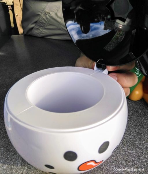 Made of plastic with a flip-up lid, the Mickey Snowman Ornament Stein is similar to the Chewbacca Souvenir Steins available at Disney’s Hollywood Studios and the Poison Apple Steins from Halloween. The small and medium paper drink cups from Disney Parks will fit right inside!