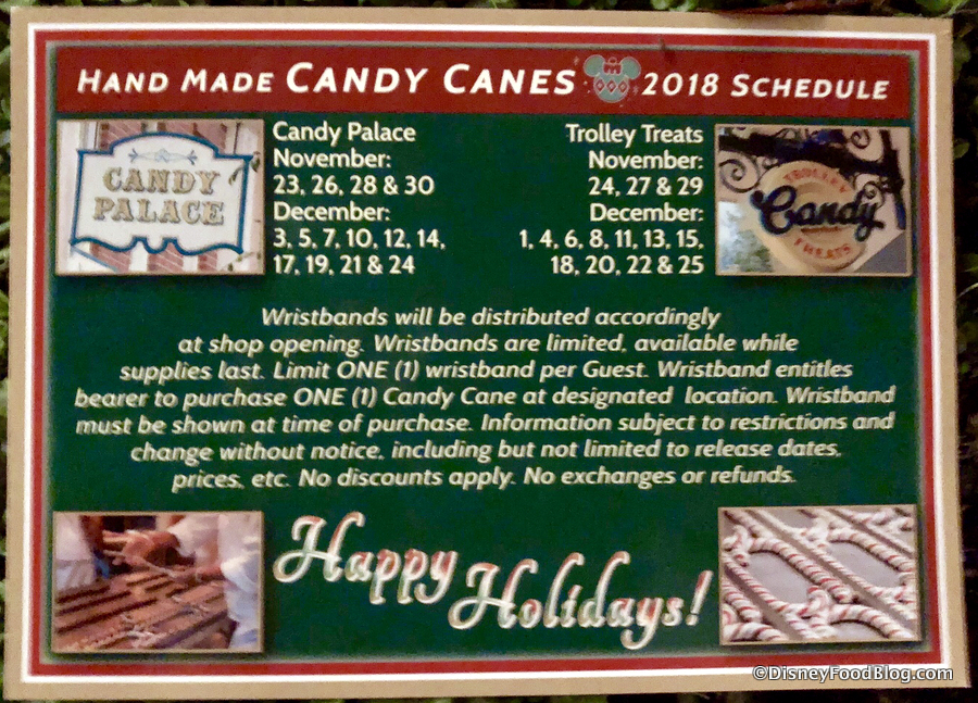Here’s our annual advice if you’re hoping to snag a Candy Cane: the rules state that guests are not supposed to line up prior to park open. But, we advise trying to line up about 30-45 minutes ahead of park opening anyway… and you likely won’t be alone. Then, proceed immediately to the designated shop upon opening. (Locations are specified by date below.)