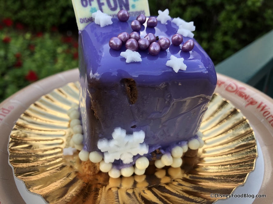 This purple present made of mousse sits atop a cookie base.