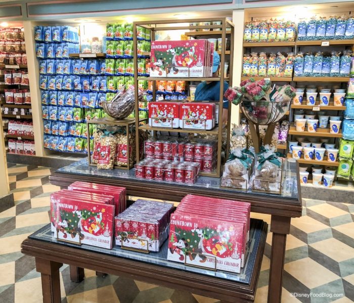 Holiday Mickey krispies, hot chocolate sets, cookies, gingerbread popcorn, and Countdown to Christmas Calendars are here, too!