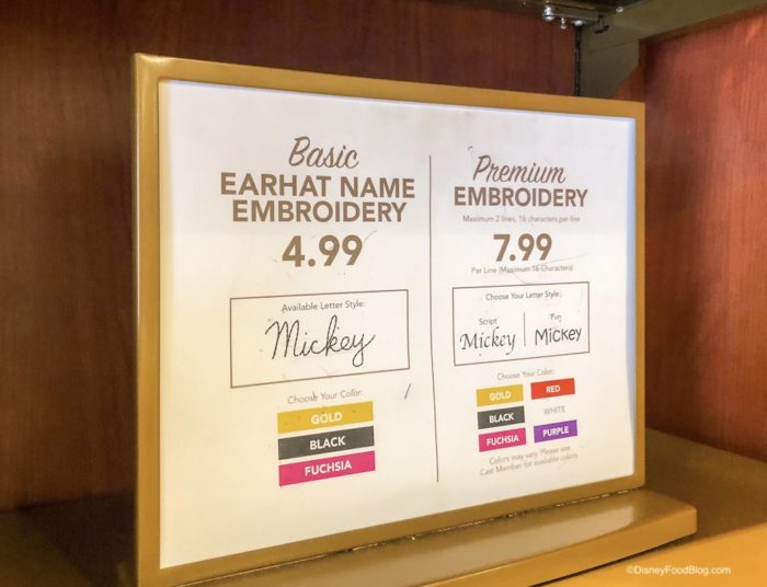 Basic embroidery starts at $4.99, and premium embroidery goes up to $7.99. Just see a Cast Member and they’ll get everything set up for you!